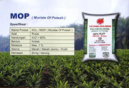 Pupuk KCl (MOP/Muriate of Potash) adalah salah satu jenis pupuk tunggal yang mengandung unsur Kalium klorida (K2O) konsentrasi tinggi sudah sangat umum digunakan karena sangat tepat diterapkan ke tanaman yang toleran terhadap klorida dan bisa diberikan ke semua jenis tanah.